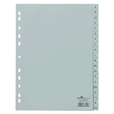 Item Name: Register Material: polypropylene Interchangeable label label: no Punched holes: 60/80 + 3 x 80 mm Description of features: with embossed tabs Tabs: A - Z Colour: grey For paper sizes: DIN A4 full coverage Width: 215/230 mm Height: 297 mm Number of sheets: 20