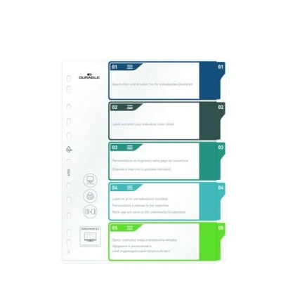 ORGANISATION: Easy to use document index set which is numbered 1-5 with coloured tabs to sort important documents PREMIUM: The index dividers have a transparent front sheet and comes is made from premium materials with a thickness of 80 µm REUSABLE: The document index system is reusable thanks to a replaceable index sheet. Designs can be created with free-to-use online software DURAPRINT UNIVERSAL: The A4 index set includes universal punching so that it can be used in folders, ring binders etc. ECO-FRIENDLY: Environmentally friendly in accordance with ISO 14021: 100% recyclable