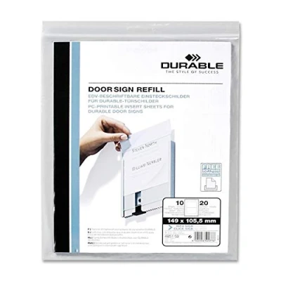 Computer inscribable insertable labels for Durable door label Info Sign Art. 4801 and Click Sign Art. 4861 10 sheets of paper with 20 tags each; with micro-perforation for easy removal Door sign inserts for professional labelling with free online software Duraprint Print sheets suitable for all common laser and inkjet printers or copiers Cardboard signs Door Sign Refill, dimensions: 149 x 105.5 mm (W x H)