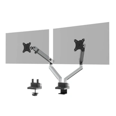 The Dual Monitor Arm is designed for individuals seeking a seamless and ergonomic workspace. This mount is ideal for holding two screens, quickly and efficiently installed on any desk through either a desk clamp or a bolt-through fixing. With its robust construction, this monitor mount is suitable for standard monitors measuring up to 32 inches and weighing up to 8 kg each.