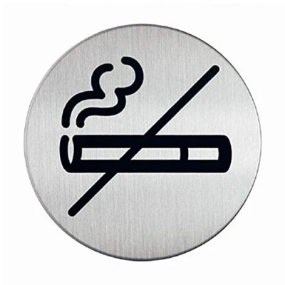 Self adhesive signs, simple and effective high quality brushed stainless steel pictograms can be applied to different surfaces using the adhesive pads included in the box contents; Diameter: 83mm; No smoking