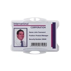EurofficeSimple name badge which holds 1 card. Securely holds 54x85mm cards. Securely hold and protect card without damaging magnetic strip. Ideal for use with a lanyard or chain. Supplied without clip/strap. Protects the name badge from being damaged.