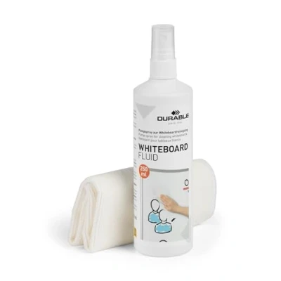 EurofficeDurable Whiteboard Cleaning Kit. Works great on most standard whiteboards. Fluid removes ink residue, grease and grime. Includes 250ml bottle of cleaning fluid and a microfiber cloth.