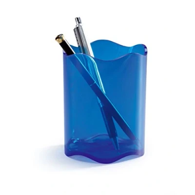 Pen holder in trendy design for the storage of pens, highlighters, scissors etc. Height of pin cup: 102 mm diameter: 80 mm Ideal addition to the BASIC and TREND desk series from Durable Color: blue transparent