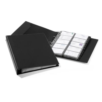 Euroffice20 transparent polypropylene pockets for up to 400 business cards. Practical business card album. 4-ring filing mechanism. Includes 12 piece polypropylene A-Z index. Colour: Black.