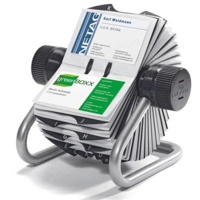 LARGE CAPACITY: Supplied with 200 business card pockets (104 x 72 mm) for storage of up to 400 cards EASY TO USE: Provides quick, simple access to cards thanks to special rotary mechanism ORGANISATION: The business card holder includes a 25 tab A-Z index for easy and quick organisation of cards DIMENSIONS: The product measures 195 x 120 x 190mm (W x H x D) making it perfect for any desktop workstation without taking up to much room REMOVE AND EXCHANGE: The inserts are quick and easy to remove and the pockets make it easy to remove business cards if required