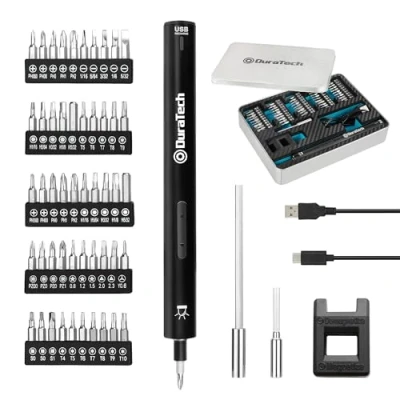 Ideal Gift: DURATECH electric precision screwdriver set with beautiful packaging and comprehensive accessories is a perfect Christmas gift for hobbyists 2 Mode: The electric precision screwdriver has an electric torque of 0.3 Nm (100 rpm) and a manual torque of 1.5 Nm. This means you can work automatically or manually and always have the right power Ergonomic design: The forward and reverse buttons ensure comfortable operation. The ergonomic design in a modern pen shape ensures a high level of operating comfort and makes operation more convenient. With 3 LED work lights on cordless screwdrivers, you can work precisely even in dark environments Wide Application: The screwdriver set is very suitable for repairing computers, laptops, tablets, smartphones, glasses, watches, toys, camera repair and other electronics. The rechargeable 700mAh lithium battery is quickly recharged thanks to the Micro-B USB connection 55-Bits Set: DURATECH electric screwdriver set contains 55 units: 50 * S2 steel precision special bits, 2*bit bar, 1*electric screwdriver handle, 1*micro-B USB charging cable, 1*magnetiser, Weight: 0.1653466965 Pounds, Manufacturer: Hang Zhou Great Star Industrial Co.,LTD