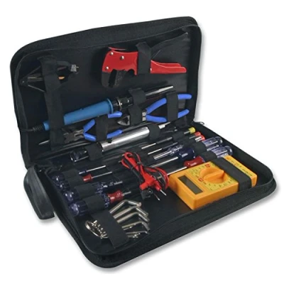 Ideal for technicians, a comprehensive electronics toolkit supplied within a handy zipped tool bag 20W/130W Soldering iron, Desoldering pump Multimeter, Wire stripper/cutter, Mains tester screwdriver Slotted screwdrivers: 4 x 75, 5 x 75, 6 x 125mm Phillips screwdrivers: PH0 x 75, PH1 x 75, PH2 x 125mm, Manufacturer: Duratool