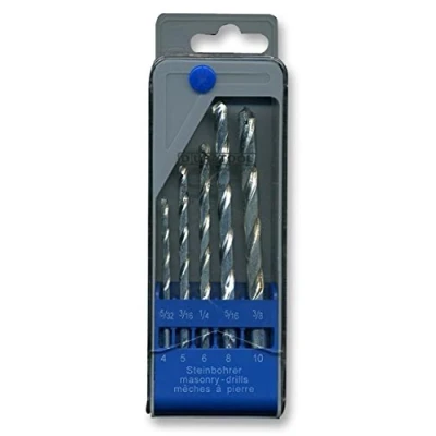 Hard alloy tipped For drilling concrete, brick, stone and slate Supplied in a plastic case Sizes: 4, 5, 6, 8, 10mm