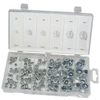 Ideal for high vibration applications Nylon insert eliminates the need for lock washers but still provides the same secure hold Made from steel Supplied in a handy, transparent assortment case Contents: 35 x M4, 35 x M5, 25 x M6, 25 x M8, 16 x M10, 10 x M12, Manufacturer: Duratool