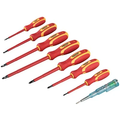 The DURATOOL D03298 is a comprehensive VDE insulated screwdriver set designed specifically for electricians, featuring 7 high-quality screwdrivers and a mains voltage tester. Each screwdriver is insulated for 1000V AC, complying with IEC60900 standards, providing safety for high-voltage electrical work. The set includes a range of Phillips and slotted screwdrivers, all equipped with soft grip handles for enhanced comfort and control. The multi-functional mains voltage tester, with a testing range of 70V-250V, makes this set ideal for various electrical tasks. Complete VDE Set: Includes a full range of Phillips and slotted screwdrivers for various applications. Safety First: Insulated for up to 1000V AC, enhancing safety when working with live wires. Comfortable Grip: Soft grip handles reduce hand fatigue during prolonged use. Mains Voltage Tester: Quickly and safely check for live electrical currents.
