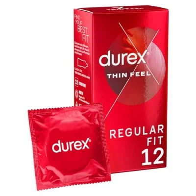 Durex Thin Feel Condoms, Regular Fit, 12s, Secure, Natural Latex, with Silicone Lube, Easy On Shape, More Sensitivity