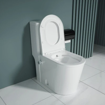 One Piece Rimless Ceramic Toilet With Bidet If you're looking for a cleaner and more convenient toilet experience, this integrated bidet-toilet design is perfect for you. The bidet nozzle is positioned on the rear edge of toilet pan, ergonomically angled and adjustable up to 180° for a refreshing cleanse after using the toilet. It's an good choice for saving toilet paper, cutting household costs, and protecting the environment. Built In Bidet Function with Chrome Nozzle Grade A Ceramic Product Open Flush Rim Design Eco Dual Flush 6 Litre Cistern Include Soft Closing Toilet Seat Made Of Urea Formaldehyde (UF) This clever bidet combines with a bidet function, a 180° adjustable chrome nozzle for a gentler and more thorough clean, and an adjustable water temperature for comfort and effectiveness. Product Features: ✅【Integrated Combined Bidet Toilet】The modern integrated bidet toilet combines the features of a toilet and a bidet, featuring a built-in bidet function with a chrome themostat
