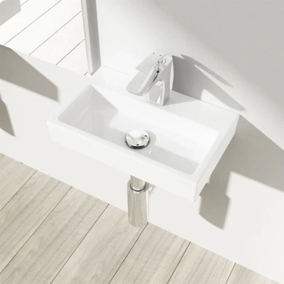 General description Durovin Bathrooms Compact Ceramic Sink is a stylish and high gloss hand-crafted basin designed to enhance your bathroom's aesthetic. This rectangular cloakroom hand washing basin features a single middle tap hole and is available for wall hung or counter top installation. The unique design combines durability with elegance, making it suitable for family bathrooms, en suites, or WCs. Technical specifications Model: HY3082 Material: Ceramic Quality: Grade A Width: 380mm Height: 70mm Depth: 240mm Shipping Weight: 5kg Overflow: No Overflow Waste Plug Required: Unslotted Compatibility and accessories Included: Wash Basin Not Included: Wall fitting kits (available separately), Waste Plug (available separately), Bottle Trap (available separately) Installation For optimal results, it is recommended to have the basin installed by a professional. Usage This basin can be wall shelf or counter top mounted on its own or as a pair for a stylish his & hers look (for this, please