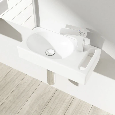 General description Durovin Bathrooms Compact Ceramic Sink is a stylish and high gloss hand-crafted basin designed for wall hung mounting. This rectangular cloakroom hand washing basin features one right-hand tap hole and includes a towel rail slot, making it a practical addition to any bathroom. The sink is available in various shapes and sizes to suit different design preferences, ensuring a perfect fit for your space. Technical specifications Model: HY3086 Material: Ceramic Quality: Grade A Width: 440mm (435mm at the bottom) Height: 90mm Depth: 220mm Shipping Weight: 4kg Overflow: No Overflow Waste Plug Required: Unslotted Compatibility and accessories Included: Wash Basin Not Included: Wall fitting kits (can be purchased from ASIN: B072JZKM7F), Waste Plug (can be purchased from ASIN: B01ENJJK72), Bottle Trap (can be purchased from ASIN: B074ZNWD3Q) Installation For optimal results, it is recommended to have the sink installed by a professional. Usage This basin can be wall shelf