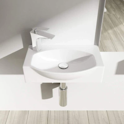 General description Durovin Bathrooms presents the Compact Ceramic Sink, a stylish and high gloss D-shaped cloakroom hand washing basin designed for wall hung mounting. This basin combines traditional craftsmanship with modern aesthetics, making it a perfect addition to any bathroom setting. Technical specifications Model: HY3084-L Material: Ceramic Quality: Grade A Width: 405mm Height: 110mm Depth: 280mm Shipping Weight: 6kg Overflow: No Overflow Waste Plug Required: Unslotted Compatibility and accessories Included: Wash Basin Not Included: Wall fitting kits (can be purchased separately), Waste Plug (can be purchased separately), Bottle Trap (can be purchased separately) Installation For optimal results, it is recommended to have the basin installed by a professional. Usage This basin is suitable for both wall shelf and counter top mounting, and can be used individually or as a pair for a his & hers look. Other information