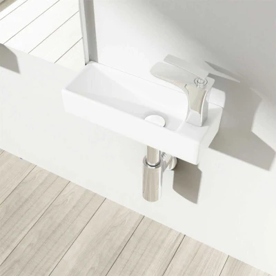General description Durovin Bathrooms Mini Ceramic Sink is a stylish and high gloss feature for your bathroom. This ultra-slim rectangular cloakroom hand washing basin is designed for wall hung mounting and includes one right-hand tap hole. The sink combines traditional craftsmanship with modern aesthetics, making it suitable for various bathroom styles. Technical specifications Model: HY3085L Material: Ceramic Quality: Grade A Width: 380mm Height: 80mm Depth: 140mm Shipping Weight: 4.5kg Taphole: Ø25mm Overflow: No Overflow Waste Plug Required: Unslotted Compatibility and accessories Included: Wash Basin Not Included: Wall fitting kits (can be purchased from ASIN: B072JZKM7F), Waste Plug (can be purchased from ASIN: B01ENJJK72), Bottle Trap (can be purchased from ASIN: B074ZNWD3Q) Installation We recommend professional installation for the best results. Usage This basin can be wall shelf or counter top mounted on its own or as a pair for a his & hers look (for this, please order two