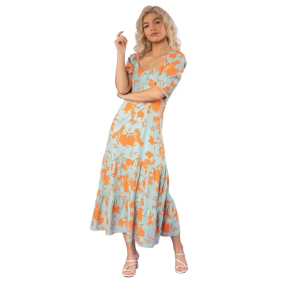 Dusk Fashion Women Button Through Floral Print Midi Dress Ladies Spring Everyday Summer Evening Vacation Work Holiday 3/4 Sleeve Smart Casual Orange Size 6