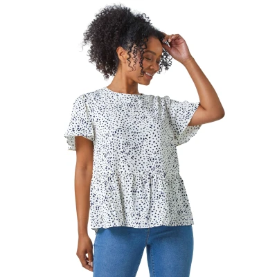 Ditsy Spot Print Peplum Top from Roman. Our new favourite print is here for your essential spring summer wardrobe collection. Made from a lightweight, multi-coloured spot print material to keep you cool this Summer, this top features a pretty flared peplum waist giving you a flawless feminine silhouette. Wear with your everyday denim and pumps or paint the town in your favourite leather-look skirt and heels for a chic holiday evening look.