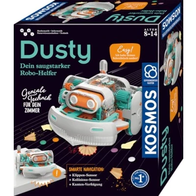 This small robot helper ensures order on the desk and gives exciting insights into the technology of robot vacuum cleaners Wild for dust and crumbs, Dusty drives over the table and simply sucks away dirt particles like a real robot vacuum cleaner. Ingenious mechanical sensors prevent the small robot from crashing or getting stuck and transparent components give exciting insights into its innermost. The coloured instructions explain the construction of the robot and show how it keeps the desk clean. "Like the big ones", children from the age of eight keep order on the desk with this Kosmos set and at the same time build themselves a pleasant everyday companion., Manufacturer: KOSMOS