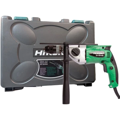 General description The HiKOKI DV20VB2 is a powerful 110V percussion drill designed for various drilling tasks. With a robust 790W motor, this drill features a 13mm keyless chuck, a two-speed gearbox, and a reverse function, making it versatile for both professional and DIY applications. It comes equipped with a soft grip handle for comfort during extended use, and includes a side handle and depth gauge for added control. Technical specifications Power Rating: 790W Supply Voltage: 110V Weight: 2.2kg No Load Speed: Hi: 0 - 3,000rpm, Lo: 0 - 1,000rpm Blows per Minute: Hi: 0 - 26,000, Lo: 0 - 8,000 Chuck Capacity: 1.5 to 13mm Impact Rate: 0-13,000/39,000 bpm Capacity: Wood: 40mm, Concrete: 20mm, Steel: 13mm Cable Length: 2m Offset of Chuck: 23.5mm Compatibility and accessories Included Accessories: Side Handle, Depth Stop, Carrying Case Installation Easy to set up with included accessories Usage Suitable for drilling in wood, concrete, and steel Variable speed control for precise
