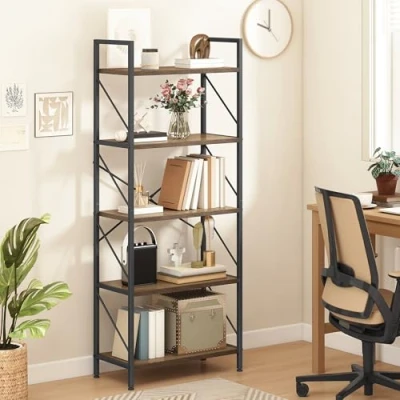 Easy to Assemble & Clean: Simply set up this 5-tier bookshelf in minutes with detailed instructions and necessary tools included; Maintenance is a breeze, just wipe down with a damp cloth to keep its pristine look Space-Saving Design: Boasting 5 shelves, this tall bookshelf is compact and lightweight, taking up minimal floor space; A great spot to display and store your favorite books, crafts, photo albums, potted plants, necessities, decorations, etc. Edge Protection: No more worries about accidental drops; This slim bookshelf is designed with side diagonal braces to keep items secure, making it ideal for displaying picture frames, figurines, glass jars, and other fragile decor Stable & Sturdy: This open bookshelf features a durable metal frame and thick engineered wood boards, with each layer supporting up to 20kg; The sleek anti-rust coating adds a modern touch, while 4 adjustable feet and anti-tip kits provide extra stability Multi-Use: With its simple, modern design, this contemporary metal bookcase seamlessly fits into any space, whether used for storage in the office, bedroom, kitchen, or garage, or as a decorative piece in the entrance, hallway, or living room