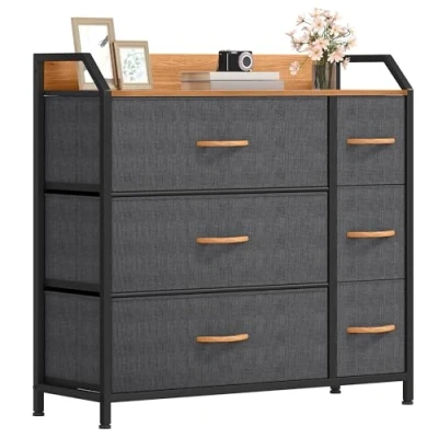 Ample Storage Space: This chest of drawers offers multiple spacious fabric drawers to store clothes, accessories, and essentials, making it easier to keep your living space tidy and organized. Sturdy Construction: Featuring a reinforced steel frame and premium wood top, along with 4 adjustable feet for stability on uneven floors, ensuring durability and safety. Premium Material Build: Crafted with high-quality fabric, durable handles, and an upgraded wood top, this storage unit ensures long-lasting performance and reliability for everyday use. Enhanced Durability: With premium construction, this dresser promises stability and functionality, this chest delivers stability and functionality, meeting your demands for a durable storage solution. Elegant & Safe Design: Improved metal components ensure a refined, elegant appearance while preventing bending or damage, making this tall dresser a stylish and secure choice for your home.