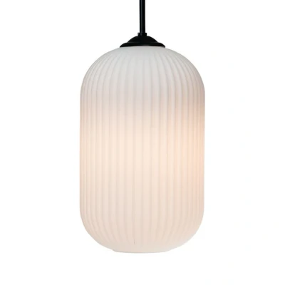 Lights.coRiflet pendant light with white glass shade with grooved pattern The Riflet pendant light with its narrow, almost oval-shaped lampshade made of opal white glass with a beautiful grooved pattern all round creates a very pleasant and glare-free light and illuminates the surroundings gently and evenly. It can be used individually to illuminate smaller tables or areas, or suspended in rows or clusters of the same or different sizes to illuminate large tables or Theke counters. Riflet is one of the Neu light series from the Danish label Dyberg Larsen, a company that focuses on developing affordable lights with a beautiful design and good quality.