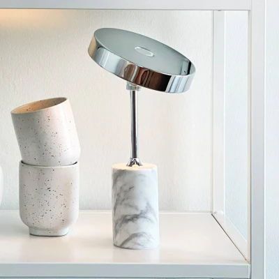 Rechargeable LED battery-powered table lamp Starlight The LED battery-powered table lamp Starlight combines Scandinavian design with materials such as metal and marble. This combination adds a stylish touch to any room, be it the living room, dining room or bedroom. The integrated LED light source provides energy-saving light that shines in a pleasant warm white colour. The head of the Starlight table lamp can A special feature of the Starlight table lamp is the ability to individually adjust the light intensity. The included touch dimmer allows you to regulate the brightness in three stages (20%, 60% and 100%), making the lamp suitable for both relaxing evenings and productive phases.