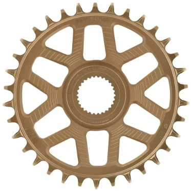 e*thirteen spared no expense creating the Helix R e*spec Chainring. Designed for Bosch Gen 4 e-bikes, this 1pc direct mount chainring is forged from 7075 AL for stiffness, strength and the longest wear life. The extensive CNC machining and M3 tooth profile delivers an ultra lightweight upgrade chainring that offers the best cross compatible Shimano/SRAM chain retention and eye-catching technical aesthetics. A custom outer dust cover enhances the integrated style and helps to preventcontamination.The Helix Race E*spec Ring is fully compatible with Shimano, SRAM, and TRP 11 and 12 speed drivetrains, and comes in Black, Bronze, Eggplant Purple or Naranja Orange for color coordination with e*thirteen cranks, cassettes, stems, tubeless valves and more. Available with 53mm chainline in 32T and 34T sizes, it supports dropping a chainring size to take full advantage of e*thirteen’s proprietary 9T smallest cog, wide range cassettes.Chain Reaction: 53mmCompatibilityBosch CX Gen4 MotorT-Type Chain CompatibleFeaturesLightweight, stiff, long wearlife, with technical aesthetics and enhanced chain retention. Cross compatibility with Shimano, Sram, and TRP 11/12s drivetrains.Included: Custom integrated Dust CoverMaterial: Forged-CNC 7075 ALMount: Direct Mount on E*thirteen Helix Race E*spec Alloy CranksSize: 32T, 34TWeight: 32T: 103g, 34T:111g (without rubber dust seal)