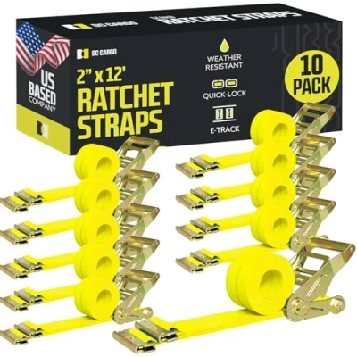 SECURE AND SAFE - These 2" x 12' Heavy Duty Ratcheting Logistic Cargo Tie-Down Straps have an assembly break strength of 3,000 pounds and a Safe Working Load Limit of 1,000 Pounds. Easily Secure Cargo Loads In Your Box Truck, Cargo Van, Pickup Bed, Flatbed/Utility Trailer, Enclosed Trailer, or Warehouse With The Convenient And Versatile E-Track System; each yellow E-Track strap tie down has E-Track spring fitting attachments at each end that click into slots on your E-Track rails or singles DURABLE - Never replace your straps again! These Ratchet Tie-Down Cargo Straps are made out of durable yellow polyester webbing (strap material) that is water- and UV ray- resistant. They won't shrink or stretch even when wet. The steel ratchet is made to ensure the most reliable trailer and truck cargo securement throughout the bumpiest rides. EASY TO USE - See the image for 6 Easy How-To Steps. 1. Open the ratchet by lifting the lever and threading the loose strap end around the bottom rod of the spindle (ratchet handle) 2. Pull the excess webbing through and pump the strap tight until it is wrapped securely around your cargo load 3. Clip the lever down and your load is secure! PROTECT YOUR PROPERTY - These Tie Down retractable ratchet straps Are Made Out Of The Most Reliable Materials Available With The Highest Standard Workmanship; click the images to see more ways to use these fabulous E-Track Tiedown Cargo Tork Strap Straps for trucks, trailers, vans, sailboats, kayaks, cars, motorcycles, RVs, and other tie down needs USA BASED COMPANY - American Service, American Quality, along with our DC Cargo 100% satisfaction guarantee
