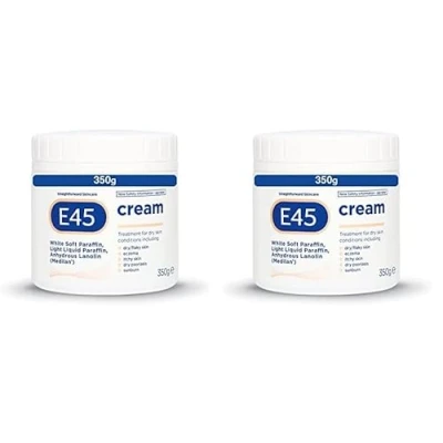 The information below applies to each unit in the pack Lanolin, light liquid paraffin and white soft paraffin have emollient moisturising properties to help keep skin hydrated Treats and soothes dry, flaking, chapped skin, as well as sunburn and detergent hands Also treats more serious dry skin conditions such as eczema, dermatitis, ichthyosis and certain dry cases of psoriasis Perfume free Dermatologically tested Directions: E45 can be used everyday by the whole family including babies. Check that the tub seal is intact before first use. Apply liberally 2 or 3 times daily or as required. For external use only.; Ingredients: Active ingredients: White soft paraffin BP 14.5% w/w, light liquid paraffin PH EUR 12.6% w/w, hypoallergenic anhydrous lanolin (medilanr) 1.0% w/w.Also contains: Glyceryl monostearate, citric acid monohydrate, cetyl alcohol