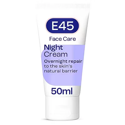 INTENSIVE MOISTURISING FOR OVERNIGHT CREAM – Nourishing face cream to restore the skin barrier overnight and promote skin recovery from the damage of the day. It is quickly absorbed into the skin, with a light-weight texture that won’t clog or block pores. Dermatologically tested, our formulation is perfume-free and vegan, so you’re safe in the knowledge that our night cream is kind to dry, sensitive, and eczema-prone skin. MOISTURISING AND PROTECTING INGREDIENTS - Our E45 night cream is formulated with five deeply nourishing oils and a high concentration of antioxidants, to restore and strengthen the natural skin barrier overnight. With Vitamin E, an antioxidant with proven anti-ageing benefits that also nourishes and protects skin from environmental nasties like UV and pollution. EASY TO APPLY – Suitable for all skin types, our night cream’s non-greasy formula is absorbed quickly without any sticky or greasy residue. To apply, squeeze a pea-sized amount and smooth over face and neck, avoiding the eye area. For best results, use as part of an evening skincare routine with the E45 Face Foaming Cleanser and E45 Face Serum. QUALITY SKINCARE EVERY DAY – For more than 70 years, E45 has been a skincare expert in dry and itchy skin and treatment for eczema, psoriasis, ichthyosis, and other dry skin conditions. We understand the importance of quality everyday products that care for your skin with minimal fuss. The E45 range of products has been developed for different skin types and parts of the body and works hard to protect and maintain skin health. Proven dermatological expertise dedicated to vulnerable dry skin. HISTORY OF E45 – We released our E45 Cream in 1952 after a customer request for a product that would soothe and protect the skin. In 1963 physicians noticed the benefits of E45 cream for dry skin conditions and our cream was introduced to pharmacy and retail in 1980. We’ve continued to create products with individual skin needs in mind. We strive to continue to serve the needs of patients and healthcare professionals and produce better treatment options for patients' skincare routines.