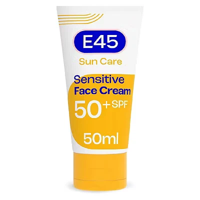 E45 SPF50+ Sensitive Sun Cream For Face with Hyaluronic Acid UVA and UVB Protection Fragrance Free Dermatologically Tested Sunscreen Suitable Dry, Eczema Prone Skin (50ml)