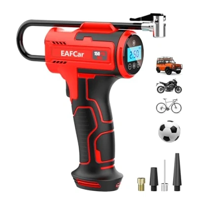 【Cordless & Ergonomic Design】The portable tyre inflator features a cordless design, freeing you from the hassle of bulky cables. Its ergonomic handle ensures a comfortable grip, making it the perfect car tyre inflator for on-the-go convenience. 【Fast Inflation & Automatic Shut Off】Our car pumps for tyres provides a strong pressure of 150 PSI, which can fully inflate standard medium-sized car tires in 3-5 minutes. When the preset pressure is reached, the tyre inflator air compressor will automatically shut off, So you don't have to stare at the tire pressure gauge all the time, freeing up your hands and making inflation easier. 【Strong Power and High Capacity】 EAFCar tyre inflator built in 4000mAh lithium battery no external power source for use. Fully charge the device for 3-4 hours for up to 20-30 minutes of continuous use,which allows you to inflate 4 car tires from 0-36 PSI. The cordless tyre inflator is equipped with an upgraded metal cylinder for faster heat dissipation. 【Easy to Use】 Operating this portable air compressor is effortless. Simply set your desired pressure, attach the nozzle to the tire valve, and press the power button. The LCD display and intuitive controls ensure user-friendliness for both beginners and experienced users. 【What You Get】1x Tyre inflator, 1x Type-C USB charging cable, 1x Bicycle conversion head, 1x Ball needle, 1x swim ring conversion head, 1x User manual.It is not only suitable for inflating car tyres but also for bikes, motorcycles, compact or mid-size SUVs, air mattresses, inflatable boats, balls, and other inflatables. However, please note that it is NOT SUITABLE FOR large trucks and motor trucks., Manufacturer: EAFCSZ