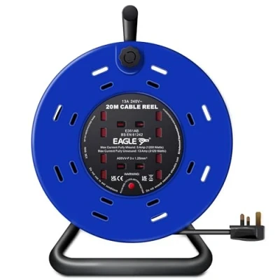 Eagle 4 x UK Plug Socket Extension Reel with A Frame Metal Holder, Restable Thermal Safety Cut Out Protection, Cushioned Easy Hold Handle, Winding Plug. Extending Lead 13 Amps 20m