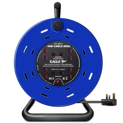 Eagle 4 x UK Plug Socket Extension Reel with A Frame Metal Holder, Restable Thermal Safety Cut Out Protection, Cushioned Easy Hold Handle, Winding Plug. Extending Lead 13 Amps 40m