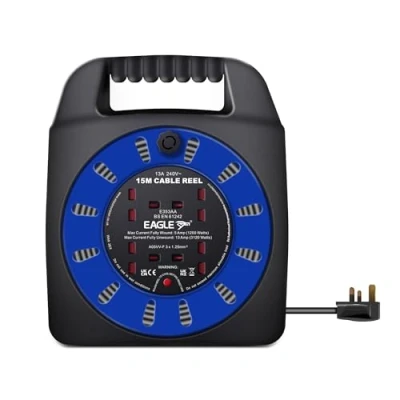 Eagle 4 x UK Socket Extension Reel with Handbag Type Holder, Restable Thermal Safety Cut Out Protection, Easy Hold Handle, Winding Plug. Extending Lead 13 Amp 15m