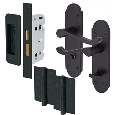SLEEK & MODERN DESIGN: Our Victorian Rectory lever on backplate door handles feature a stylish sweeping handle design with vintage-style curved backplate to complement your interior décor. Designed with ergonomics in mind, our door handle provides a comfortable & secure grip. Bathroom handle features thumbturn for easy operation and coin release lock to allow access from the outside in case of emergency DURABLE & LONG-LASTING: High quality black powder coating to resist corrosion & wear. The strong integrated spring mechanism ensures these handles are built to withstand daily use. EASY INSTALLATION: Installing our Rectory door handles is a breeze, thanks to the included hardware (1 x pair of bathroom handles with matching screws, 1 x bathroom sashlock 64mm case/44mm backset, 1 x pair 76mm ball bearing hinges, 1 x matching keep.) It’s a DIY-friendly solution that saves you time & hassle. SUITABLE FOR: All standard left & right-handed interior doors with a thickness of 30-45mm. Size: Backplate size 170 x 46mm (L x W), Handle Length: 95mm. Please refer to our images for detailed dimensions., Weight: 88.1849048 pounds, Manufacturer: EAI
