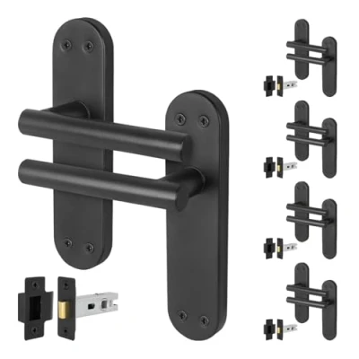 SUITABLE FOR: Our Oliena matt black internal door handles with latches are perfect for your home or office, featuring a modern and minimalist design that suits any interior - ideal for both modern and traditional environments BUILT TO LAST: Our t-bar black door handles are finished with a high quality matt black finish to resist corrosion and wear. SMOOTH ACTION: Our handles feature a strong integrated spring mechanism, keeping the lever handle firm, silent and perfectly horizontal. With the included heavy duty tubular latch our door handle pack is able to withstand constant daily use, within your home or office SIZE: Backplate 175 x 42mm, handle length 120mm, with a 100mm spindle that can be cut to size for doors 35-44mm thick. Please refer to our images for details dimensions PACK CONTAINS: 4 pairs of door handles, 4 tubular latches and matching fixings, Manufacturer: EAI