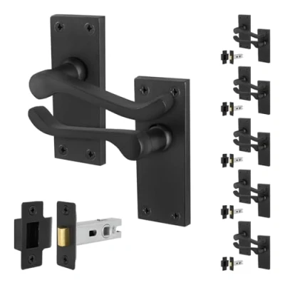 SUITABLE FOR: Our victorian scroll black internal door handles with latches are perfect for your home or office, featuring a modern and minimalist design that suits any interior - ideal for both modern and traditional environments BUILT TO LAST: Our black door handles are finished with a high quality matt black coating to resist corrosion and wear. SMOOTH ACTION: Our handles feature a strong integrated spring mechanism, keeping the lever handle firm, silent and perfectly horizontal. With the included heavy duty tubular latch our door handle pack is able to withstand constant daily use, within your home or office SIZE: Backplate 107 x 41mm, handle length 94mm, with a 100mm spindle that can be cut to size for doors 35-44mm thick, tubular latch 64mm with 44mm backset. Please refer to our images for details dimensions PACK CONTAINS: 6 pairs of door handles, 6 tubular latches and matching fixings, Manufacturer: EAI