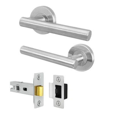 EAI Door Handle Latch Set Satin Nickel Round T Bar Internal Handles & (64mm) Lever on Rose Oliena Range