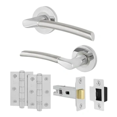 SUITABLE FOR: Our Bova chrome internal door handles with latches and hinges are perfect for your home or office, featuring a modern and minimalist design that suits any interior - ideal for both modern and traditional environments BUILT TO LAST: Our silver door handles are finished with a high quality polished chrome and satin nickel finish to resist corrosion and wear. The included grub screw to spindle fixing and back to back fixing bolts ensure a solid, durable fit to your door, so the handles won't come loose over time SMOOTH ACTION: Our handles feature a strong integrated spring mechanism keeping the lever handle firm, silent and perfectly horizontal. With the included heavy duty tubular latch, smooth ball bearing hinges our door handle pack is able to withstand constant daily use, within your home or office SIZE: Rose diameter 54mm, handle length 124mm, with a 100mm spindle that can be cut to size for doors 35-44mm thick, tubular latch 64mm with 44mm backset, hinges 76mm. Please refer to our images for details dimensions PACK CONTAINS: 1 pair of door handles, 1 tubular latch, 1 pair of hinges and matching fixings, Weight: 88.1849048 Pounds, Manufacturer: EAI