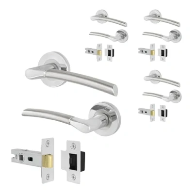 SUITABLE FOR: Our Bova chrome internal door handles with latches are perfect for your home or office, featuring a modern and minimalist design that suits any interior - ideal for both modern and traditional environments BUILT TO LAST: Our silver door handles are finished with a high quality polished chrome and satin nickel finish to resist corrosion and wear. The included grub screw to spindle fixing and back to back fixing bolts ensure a solid, durable fit to your door, so the handles won't come loose over time SMOOTH ACTION: Our handles feature a strong integrated spring mechanism, keeping the lever handle firm, silent and perfectly horizontal. With the included heavy duty tubular latch our door handle pack is able to withstand constant daily use, within your home or office SIZE: Rose diameter 54mm, handle length 124mm, with a 100mm spindle that can be cut to size for doors 35-44mm thick, tubular latch 64mm with 44mm backset. Please refer to our images for details dimensions PACK CONTAINS: 4 pairs of door handles, 4 tubular latches and matching fixings, Weight: 4.6737999544 Pounds, Manufacturer: EAI