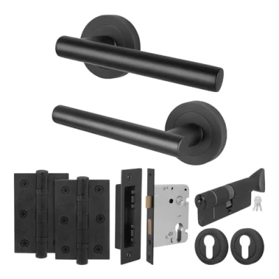 SUITABLE FOR: Our Olvera matt black internal door handles with locks and hinges are perfect for your home, office or light commercial setting, featuring a modern and minimalist design that suits any interior - ideal for both modern and traditional environments BUILT TO LAST: Our black door handles are finished with a high quality matt black finish to resist corrosion and wear. The included grub screw to spindle fixing and back to back fixing bolts ensure a solid, durable fit to your door, so the handles won't come loose over time SMOOTH ACTION: Our handles feature a strong integrated spring mechanism keeping the lever handle firm, silent and perfectly horizontal. With the included heavy duty lock, cylinder, smooth ball bearing hinges our door handle pack is able to withstand constant daily use, within your home or office SIZE: Rose diameter 51mm, handle length 123mm, with a 100mm spindle that can be cut to size for doors 35-44mm thick, euro profile lock 78mm with 57mm backset, 5 pin 35/35mm euro thumb turn cylinder, hinges 76mm, euro escutcheon diameter 54mm. Please refer to our images for details dimensions PACK CONTAINS: 1 pair of door handles, 1 euro profile lock, 1 double cylinder. 1 pair of hinges, 2 euro escutcheons, 3 keys and matching fixings, Manufacturer: EAI
