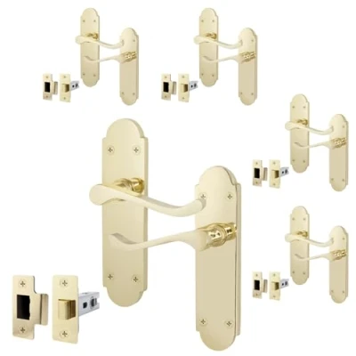 SLEEK & MODERN DESIGN: Our Victorian Scroll Shaped lever on backplate door handles feature a stylish sweeping handle design with vintage-style curved backplate to complement your interior décor. Designed with ergonomics in mind, our door handle provides a comfortable & secure grip. DURABLE & LONG-LASTING: High quality brass coating to resist corrosion & wear. The strong integrated spring mechanism ensures these handles are built to withstand daily use. EASY INSTALLATION: Installing our Scroll Shaped door handles is a breeze, thanks to the included hardware (5 x pair of door handles with matching screws, 5 x tubular latches 64mm case/44mm backset, 5 x pairs 76mm ball bearing hinges, 5 x matching keeps.) It’s a DIY-friendly solution that saves you time & hassle. SUITABLE FOR: All standard left & right-handed interior doors with a thickness of 30-45mm. Size: Backplate size 170 x 46mm (L x W), Handle Length: 95mm. Please refer to our images for detailed dimensions., Manufacturer: EAI