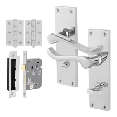 SUITABLE FOR: Our victorian scroll chrome internal door handles with lock and hinges are perfect for your home or office, featuring a modern and minimalist design that suits any interior - ideal for both modern and traditional environments BUILT TO LAST: Our silver door handles are finished with a high quality polished chrome finish to resist corrosion and wear. SMOOTH ACTION: Our handles feature a strong integrated spring mechanism keeping the lever handle firm, silent and perfectly horizontal with the included heavy duty bathroom lock, smooth ball bearing hinges, our door handle pack is able to withstand constant daily use, within your home or office SIZE: Backplate 150 x 41mm, handle length 94mm, with a 100mm spindle that can be cut to size for doors 35-44mm thick, bathroom lock 64mm with 44mm backset, hinges 76mm. Please refer to our images for details dimensions PACK CONTAINS: 1 pair of bathroom door handles, 1 bathroom lock, 1 pair of hinges and matching fixings, Manufacturer: EAI
