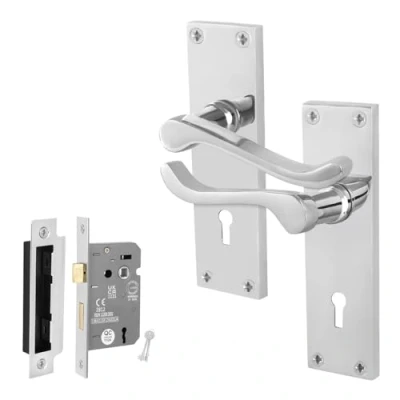 Amazon MarketplaceSUITABLE FOR: Our victorian scroll chrome internal door handles with locks are perfect for your home or office, featuring a modern and minimalist design that suits any interior - ideal for both modern and traditional environments BUILT TO LAST: Our silver door handles are finished with a high quality polished chrome finish to resist corrosion and wear. SMOOTH ACTION: Our handles feature a strong integrated spring mechanism, keeping the lever handle firm, silent and perfectly horizontal. With the included heavy duty sash lock, our door handle pack is able to withstand constant daily use, within your home or office SIZE: Backplate 107 x 40mm, handle length 94mm, with a 100mm spindle that can be cut to size for doors 35-44mm thick, sash lock 64mm with 44mm backset. Please refer to our images for details dimensions PACK CONTAINS: 1 pair of door handles, 1 sashlock, 2 keys and matching fixings, Manufacturer: EAI