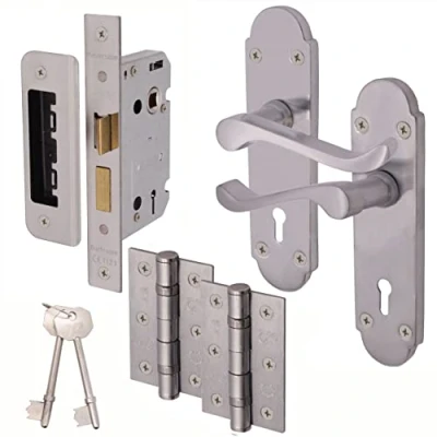EAI Satin Door Handle Key Lock Set Victorian Scroll Shaped 1 Pair of Internal Chrome Lever Handles on Backplate with Hinges (76mm), Sash (64mm) & Keys
