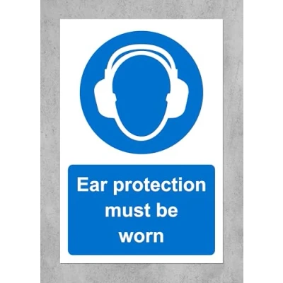 Ear protection must be worn safety sign 1.2mm Rigid plastic 200mm x 150mm Digitally printed for extra durability Drill and screw in position or use double sided tape to mount onto suitable surface.